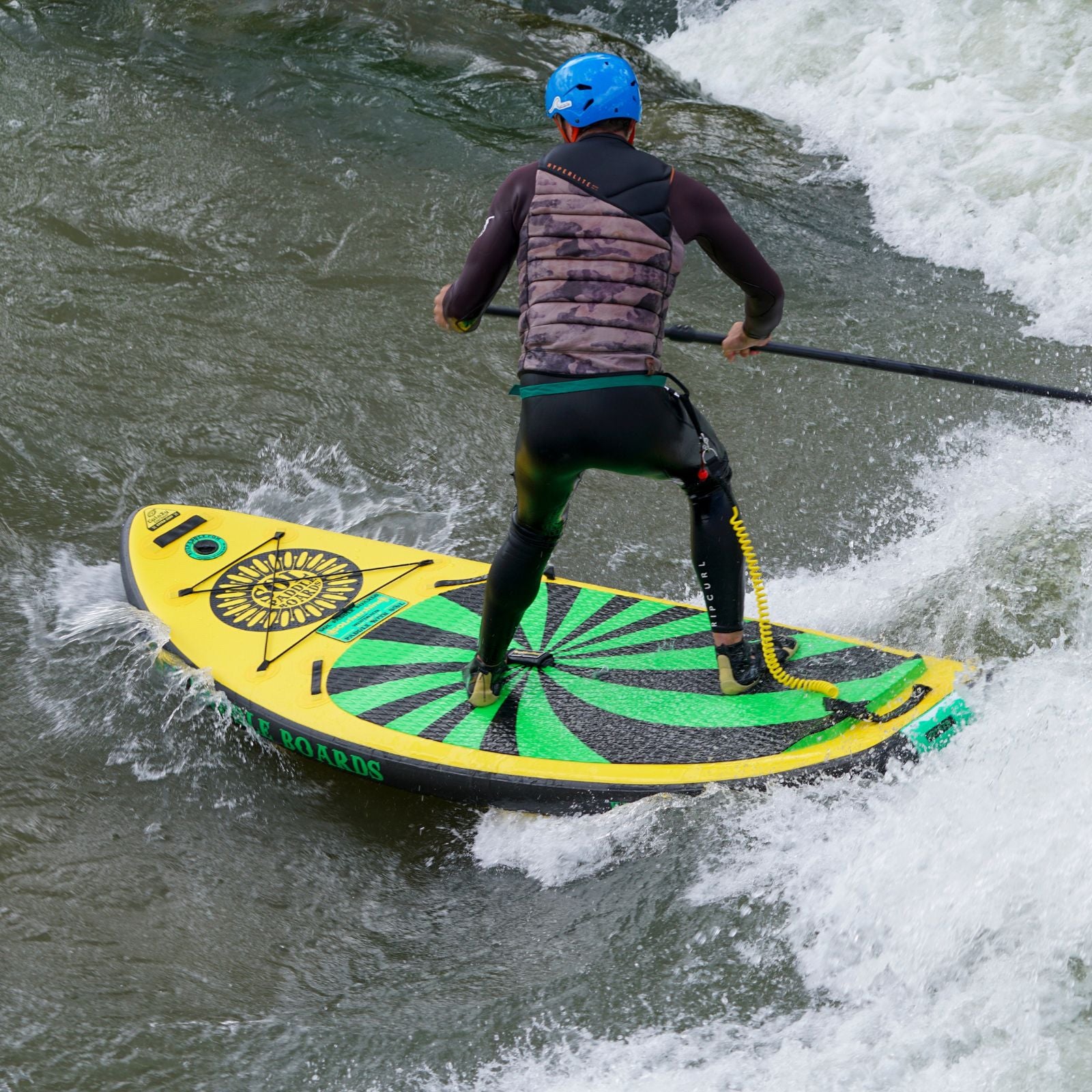 → Whitewater grade nylon handles—for optimum sun and dry rot protection — located at the front, rear, and both sides, providing multiple and durable grip points for easier carrying and handling of the board, even in challenging whitewater conditions